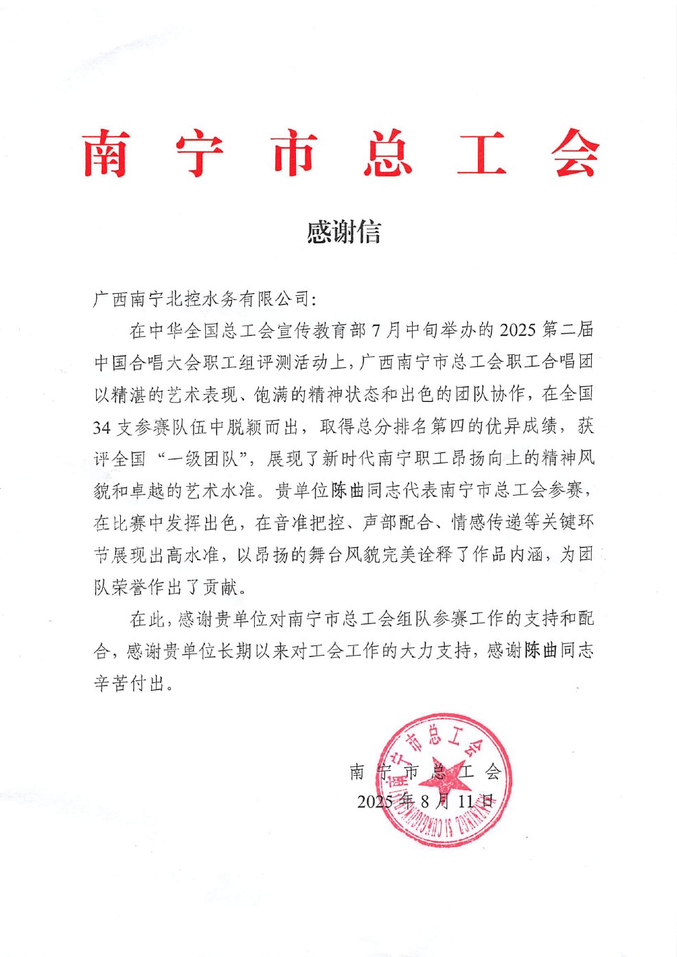 廣西南寧北控水務(wù)有限公司獲南寧市總工會致信表揚(yáng)2025-08-25